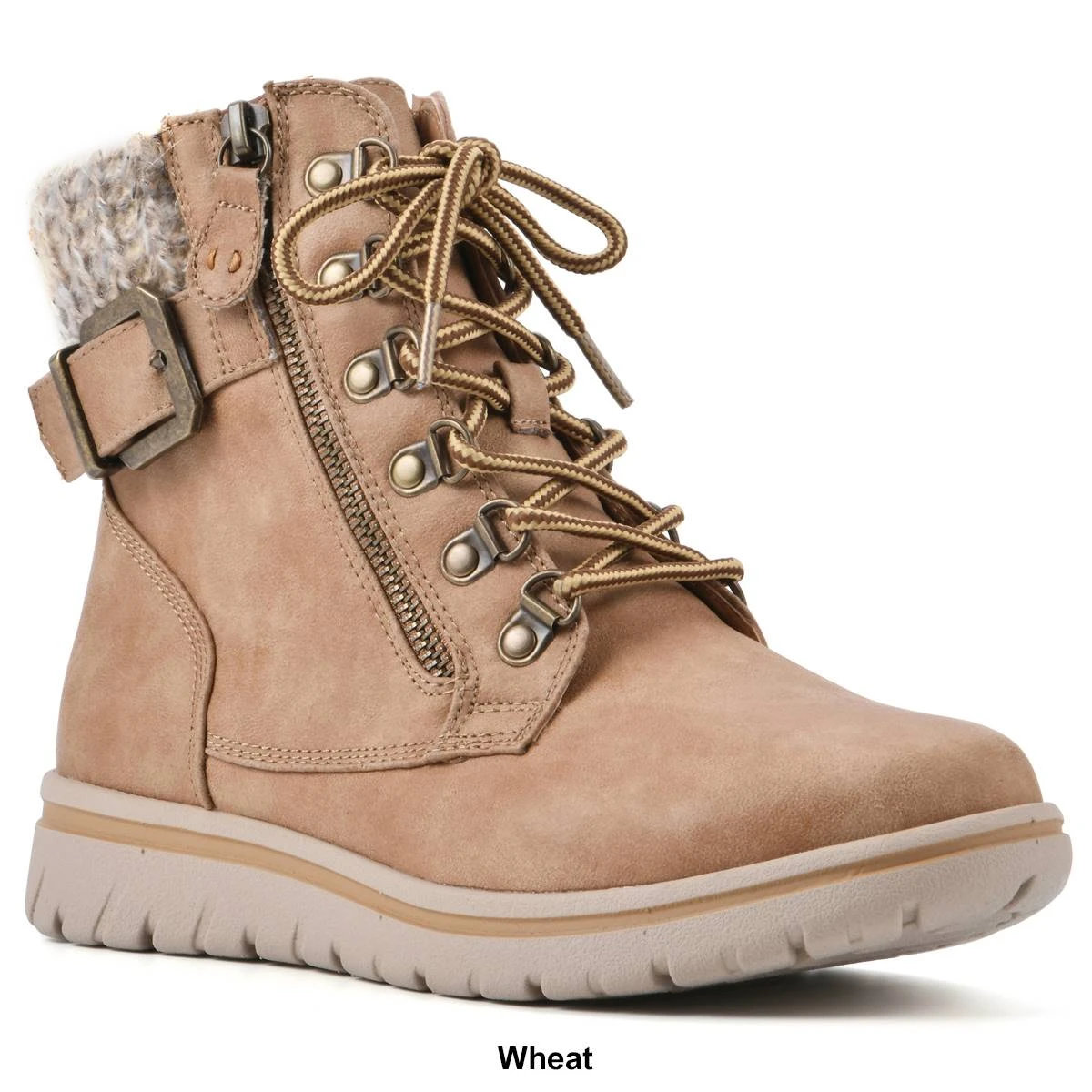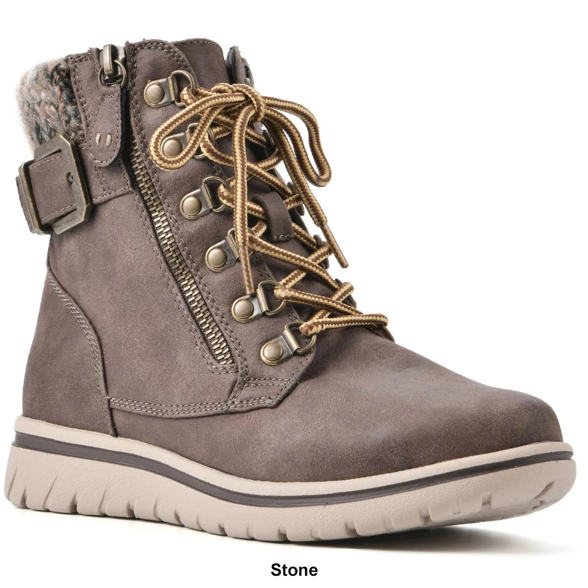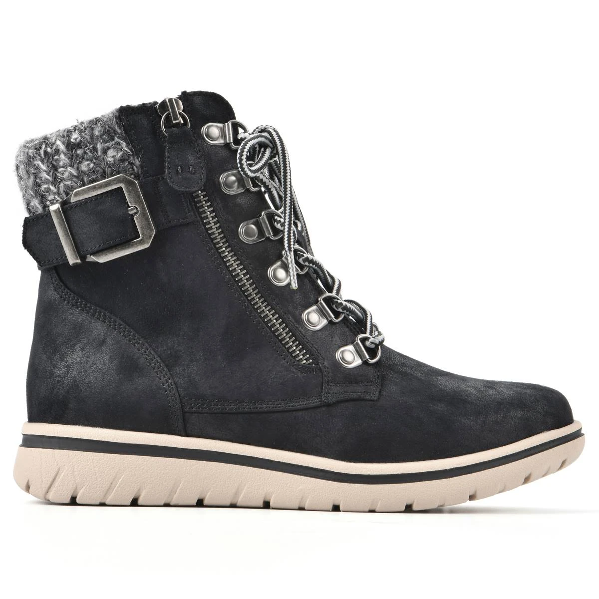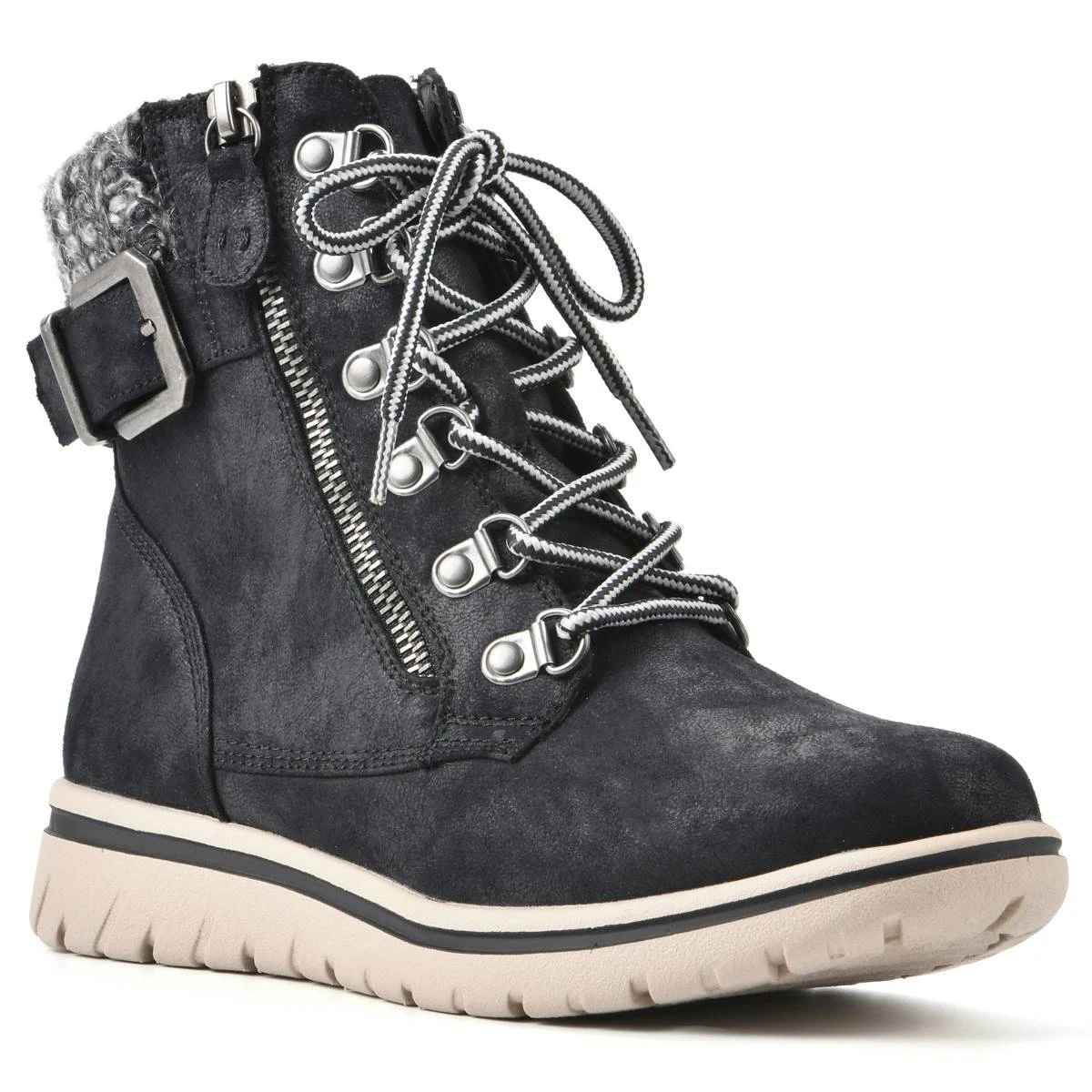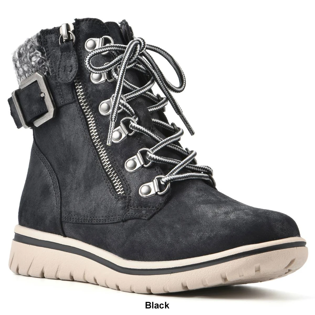 Set the stage with these Womens Cliffs by White Mountain Hearty lace-up ankle boots. Features a decorative zipper, buckle accents, and a knit collar that adds a snuggly style to this cold weather staple.